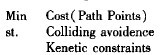 所谓满足动力学约束条件是指求得的路径易于机器人控制系统进行跟踪,即可以较容易地根据求得的顺序点列生成相应的机器人各个驱动电机的控制数据,并且这些控制数据在机器人动力系统的允许范围之内。动力学约束条件包括:关节角的调节范围,角速度、角加速度限制,速度、加速度限制等等。动力学约束条件有两种类型:完整性约束和非完整性约束。