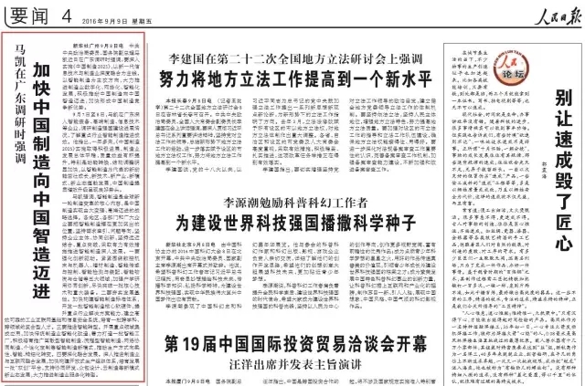 图:2016年9月9日,《人民日报》第4版“要闻”做了题为《马凯在广东调研时强调:加快中国制造向中国智造迈进》的报道